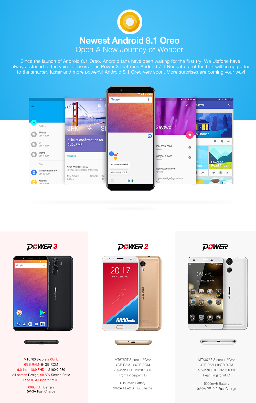 6.0 inch Ulefone Power 3 4G Phablet Corning Gorilla Glass 4 Screen Android 7.1 MTK6763 Octa Core 2.0GHz 6GB RAM + 64GB ROM Hi-Fi Face Recognition Quad Cameras 6080mAh Battery.