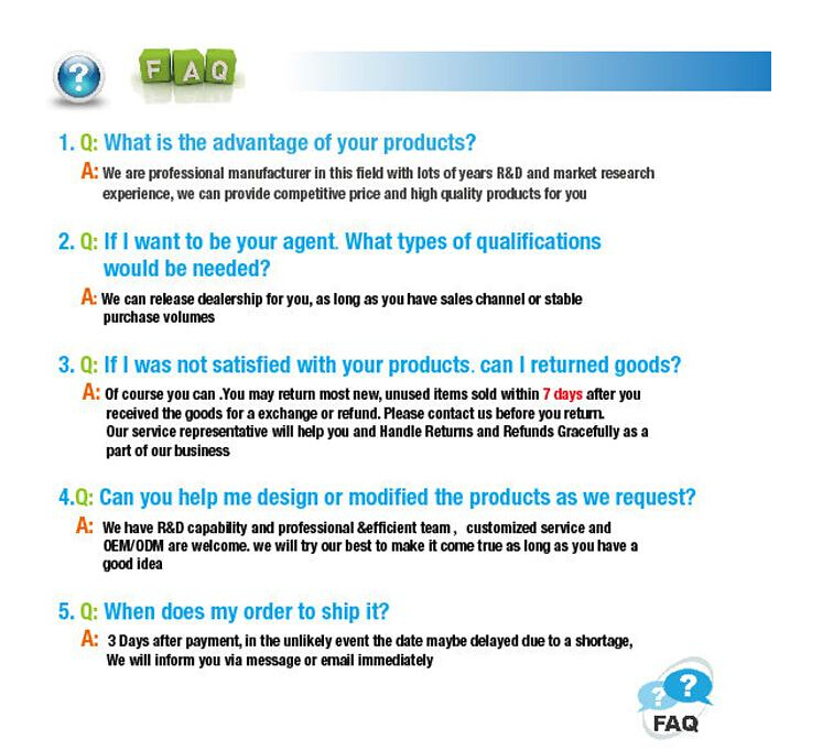 4) Delivery Time: We will ship the goods within 7 days after receiving payment.